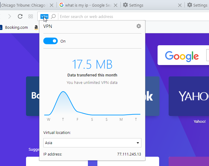 Evo, prvi del naloge si opravil. Zdaj zapreš nastavitve v ukazni vrstici že lahko vidiš moder napis VPN. Klik nanj ti bo v pokazal, koliko prometa je šlo prek tega VPN tunela. Pod grafom pa lahko izbiraš, kje je tvoja virtualna lokacija. Izbereš po lastni presoji, če se pa hočeš izogniti tistim GDPR opozorilom na tujih straneh, pa predlagam, da izbereš Azijo. Vsekakor pa nočeš biti v Evropi.